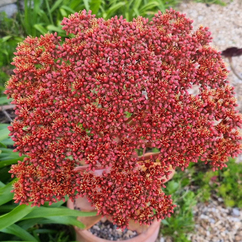 Aeonium nobile can be a lush green colour but when kept in dry conditions, it can turn a deep, vibrant red. This plant will also change colour before flowering. This is one of the most spectacular flowers in the Aeonium world.